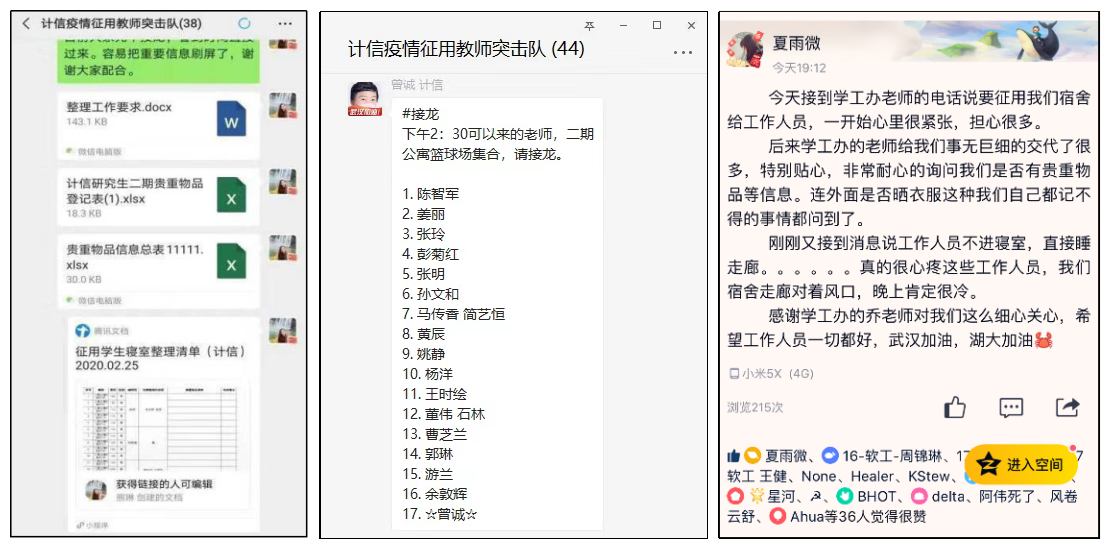 在疫情防控的攻坚阶段,公司二期宿舍被征用作为新冠肺炎治愈患者出院后的集中隔离点,公司积极响应,快速反应,第一时间成立了以公司党委书记潘永才、经理王时绘为组长的工作组,连夜制定方案。一方面,学院迅速发动辅导员、班主任、员工骨干、班委,逐一电话、QQ联系住在二期的同学,告知征用事宜,做好解释工作,登记员工的贵重物品,奋战通宵,确保员工贵重物品损失降到最低;另一方面,连夜联系学院在汉教师党员、住在学校附近的教师,组建了34人的“教工突击队”开展工作,在汉的全体院领导,系部主任、教工党支部书记主动带头,一线参与战斗。
