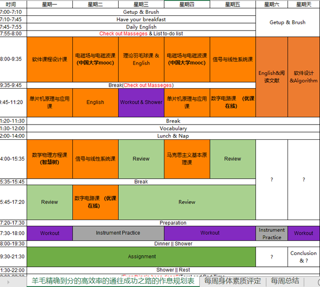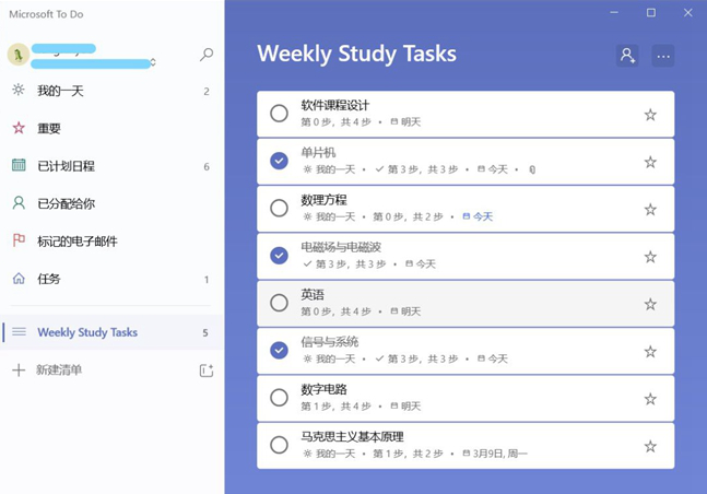 杨心悦一直秉承着“今日事今日毕”的原则,在开学前便制定了精确的时间规划表。每到周末,她会根据自己的实际完成情况打分,分析调整学习状态,并实行自我激励机制,激发学习热情。同时,结合课程和自身学习特点,利用Microsoft to do安排好下一周的学习任务,并对任务完成情况进行追踪。