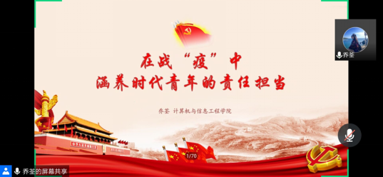 5月28日晚7时,学院老师乔荃以“在战‘疫’中涵养时代青年的责任担当”为主题,从战“疫”中所见出发,讲述了面对疫情对人民和社会带来严重威胁的情况下,以习近平同志为核心的党中央临危不惧、勇于担当,广大医护人员不怕牺牲、无私奉献,全国上下众志成城、齐心协力抗击疫情的表现。她表示,这场疫情促使我们警醒、改变、奋进,使强国强军在全国上下形成更广泛的共识、更自觉的行动。她希望同学们坚定理想信念、勇担社会责任,让青春在党和人民最需要的地方绽放绚丽之花。