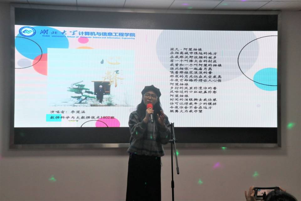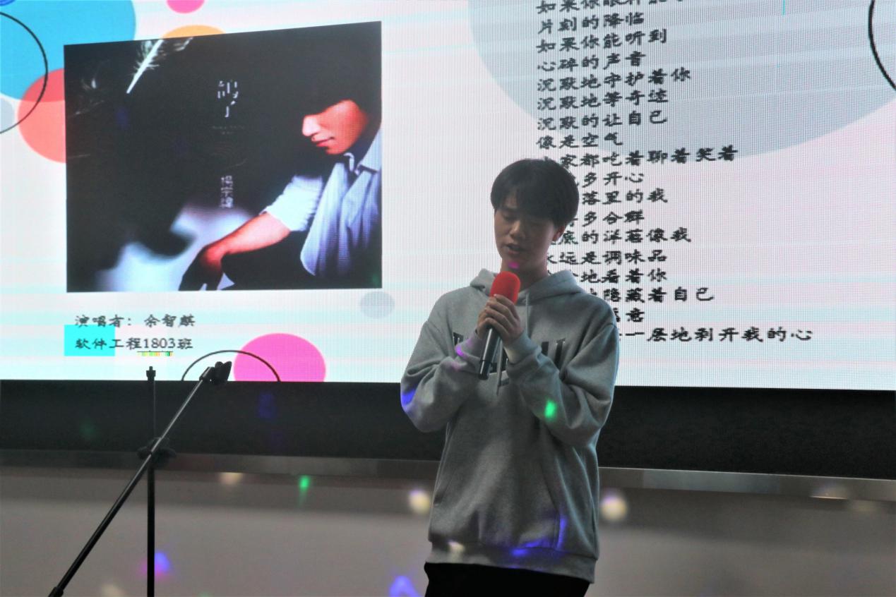 活动开始,主持人介绍现场评委、大赛流程和评分细则。随后,各位选手依次走上舞台,倾情演唱,随着软件工程1903班李强裕演唱的《我的名字》响起,预示着比赛正式开始,台下观众们热情高涨。欢快愉悦的《红色高跟鞋》,忧郁伤感的《残酷月光》,柔情似水的《烟雨行舟》,深情投入的《阿楚姑娘》,慷慨激昂的《你的答案》,风格别样的《HALO》,一首首悦耳动人的歌曲如一幅幅水彩画缓缓铺呈观众面前,让人如身临其境般步入歌曲中唯美的场景。选手们充分展现了自己的才华横溢和青春的个性飞扬,给观众们带来了一场听觉盛宴。紧接着,各位评委在现场给各位选手进行评分,员工观众们也在线上为自己喜欢的选手投票。
