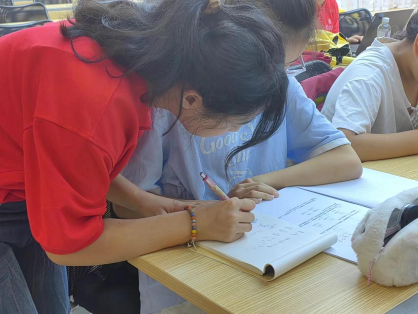 面对即将升入新年级的孩子们,在作业辅导环节中,“智慧夏令营队”根据孩子们的年级和学科需求,分组进行一对一或小组辅导,耐心解答每一个疑问,引导孩子们在轻松愉快的氛围中巩固知识、查漏补缺。