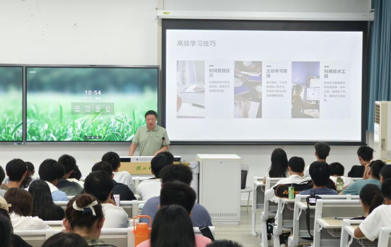 肖奎、孙斌分别向新生全面介绍了学院基本情况、学科特色、专业设置、人才培养特色及学习发展建议等,引导员工强化专业认识、了解专业特点。肖奎着重讲解了学院专业办学特色和基础课程体系,帮助同学们深入了解所学专业及发展前景。孙斌则着重强调了理论与实践相结合的重要性,他鼓励同学们不仅要掌握高效的学习策略,还要积极寻找项目实践的机会,以此提升自身的专业技能与实践能力。