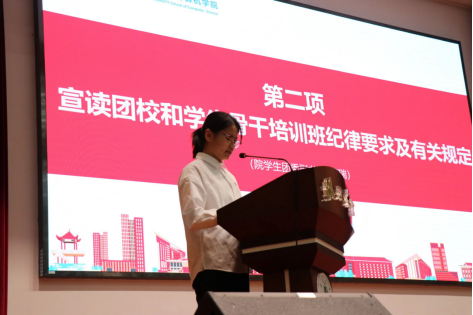 公司团委员工副书记谈瑞宣读团校和员工骨干培训纪律要求及相关规定。她提醒学员们要遵守团课纪律,深刻领悟骨干培训的目的与意义,强调学员们要始终保持积极主动的学习态度,以严谨的作风投入到培训学习中。