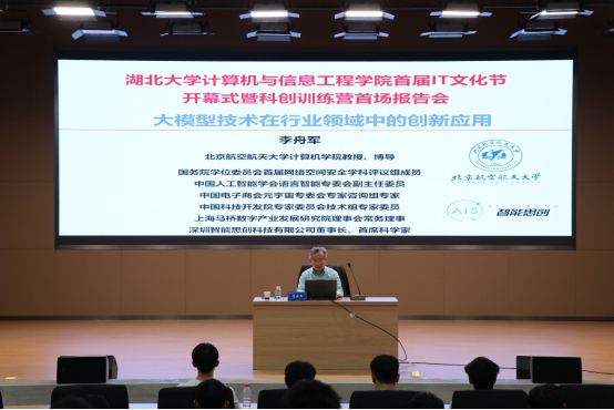 李舟军教授以《大模型技术在行业领域中的创新应用》为主题,从大模型的兴起、大模型在垂直行业中的创新应用、前沿探索等三个维度,深入浅出地阐述了企业应用大模型的现状以及如何攻克大模型在企业落地的难题。李舟军教授向师生展示了所在团队多年来研发的基于人工智能大模型与企业知识库的问答系统,呈现了实际应用中的效果。