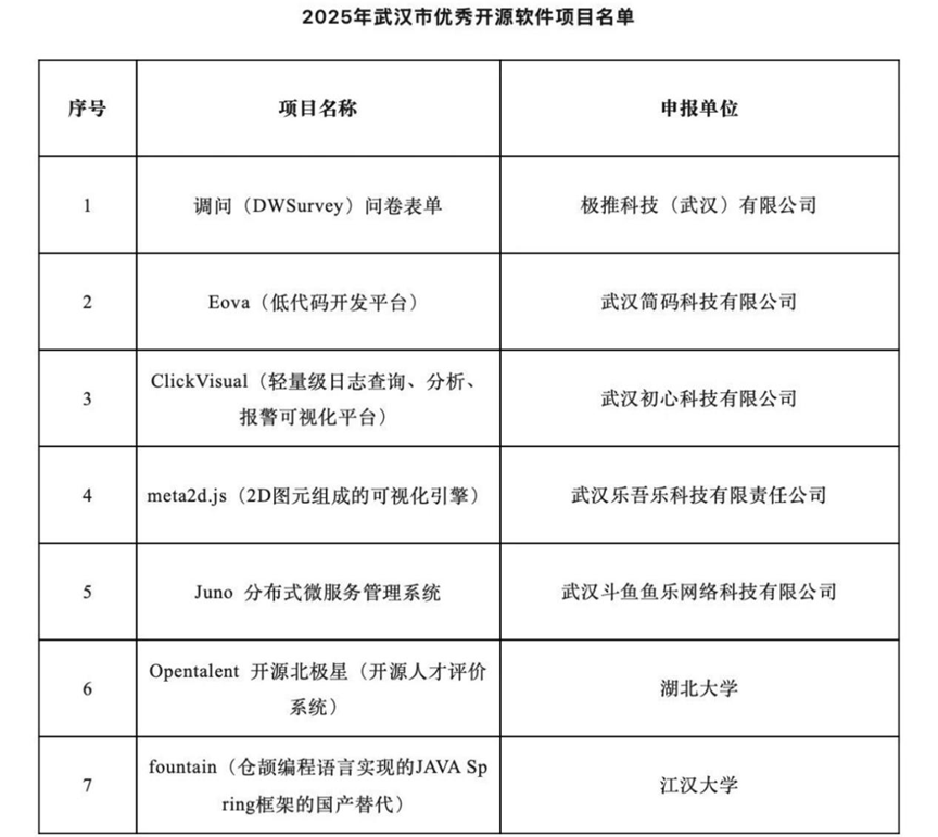 2025 年 11 月 20 日,武汉市经济和信息化局正式公示 2025 年武汉市优秀开源软件项目名单,由威廉希尔WilliamHill官方网站、OS-HUBU 高校开源社区与武汉市开源创新中心(开源评价与大数据方向)申报的 Opentalent(开源北极星)开源人才评价系统成功入选,这一成果标志着武汉在开源人才生态建设领域的创新实践获得官方权威认可,为我国开源生态建设和人才培养提供了关键技术及工具支撑。