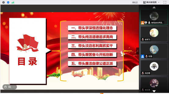 (七)9月22日晚7点,威廉希尔WilliamHill官方网站-贵州税务研究生工作站在腾讯会议上开展“学会议精神,思廉政文化”主题党日活动。此次线上会议与会人员重点围绕《习近平谈治国理政》第三卷,习近平在中央政治局第二十一次集体学习时的重要讲话精神,中央、省委关于“十四五”规划编制的重要会议精神开展学习。支部书记崔海波讲授“牢记初心使命,在清正廉洁上走在前列”专题廉政党课,党课共分为五个部分,分别是“带头学深悟透,强化理念”、“带头纯洁道德,追求高尚”分、“带头淡泊名利,真抓实干”、“带头艰苦奋斗,开拓创新”、“带头廉洁自律,公道正派”。他结合自身学习、工作中遇到的真实事件,为员工党员举例讲解工作中的廉政作风。支部副书记张震海提出员工党员在日常生活中不可拉帮结派,应实事求是,走好自己的求学之路。