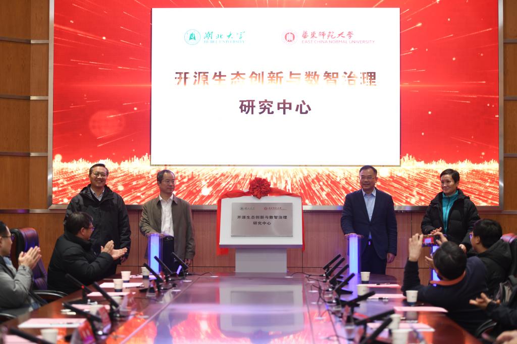 12月23日下午,威廉希尔WilliamHill官方网站与华东师范大学联合成立开源生态创新与数智治理研究中心,揭牌仪式在学校会议中心举行。华东师范大学、东北大学、武汉大学、北京航空航天大学、西北工业大学、威廉希尔WilliamHill官方网站等高校和湖北省大数据中心的专家学者参会。湖北省经信厅软件处处长董爱军、威廉希尔WilliamHill官方网站党委常委李振出席会议并讲话。